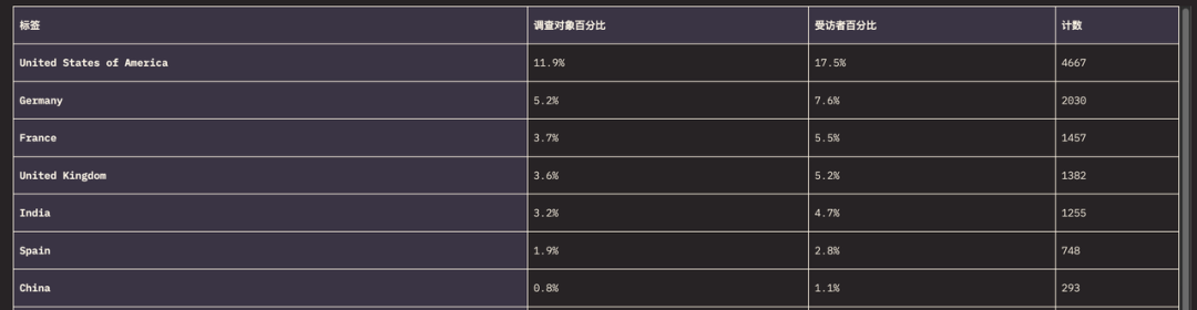 上图截取了调查中回收问卷数量前五名,以及来自中国的问卷数量。从中国回收的问卷占了全部问卷的 0.8%,和去年相比,问卷回收数量涨了一倍。