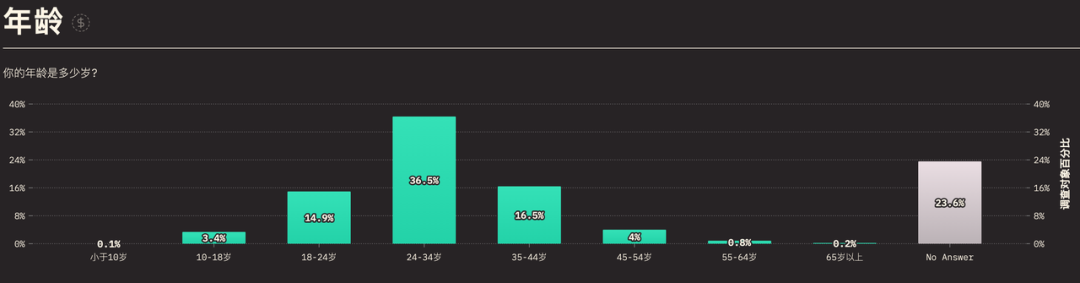 今年的调查还单独统计了开发人员年龄,可以看到绝大部分的前端开发者都是在 24 到 34 岁之间的,也有 16.5% 的前端开发者在 35 到 44 岁之间。虽然参与这份调查的大部分都是外国的开发人员,放到中国的话大概率会年轻化一些,不过这张图也能很好的反映出前端开发者的年龄画像了——大部分为 24-34 岁的年轻人。