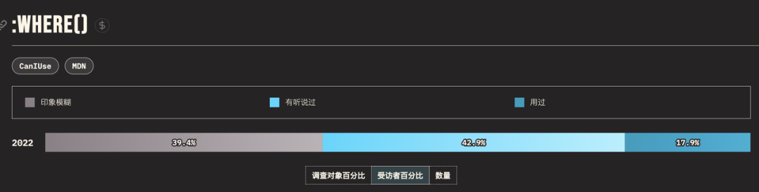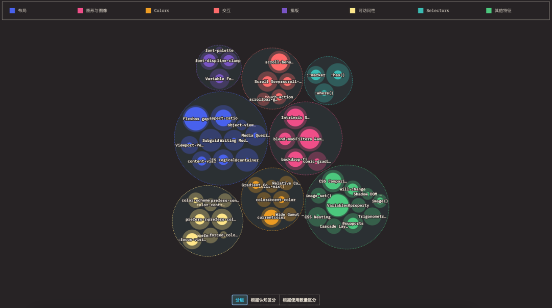 这种 HTML 无障碍的特性用的比较多,其他都是一些使用度很低的冷门特性。在选择器(Selector)方面, :where