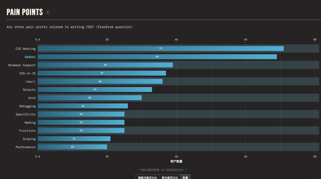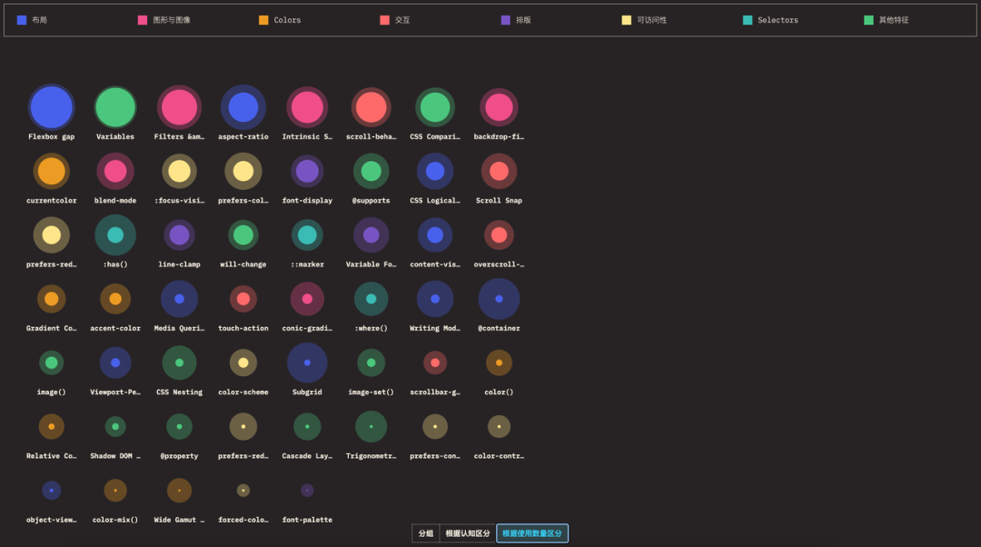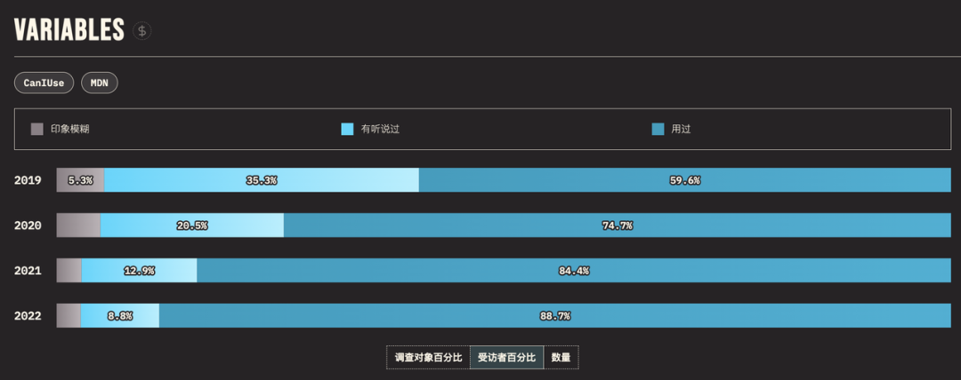 在其他特性中,使用人数最多的两位都是我们的老朋友了,分别是css variable