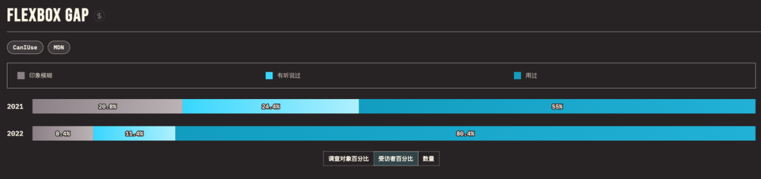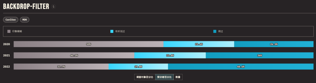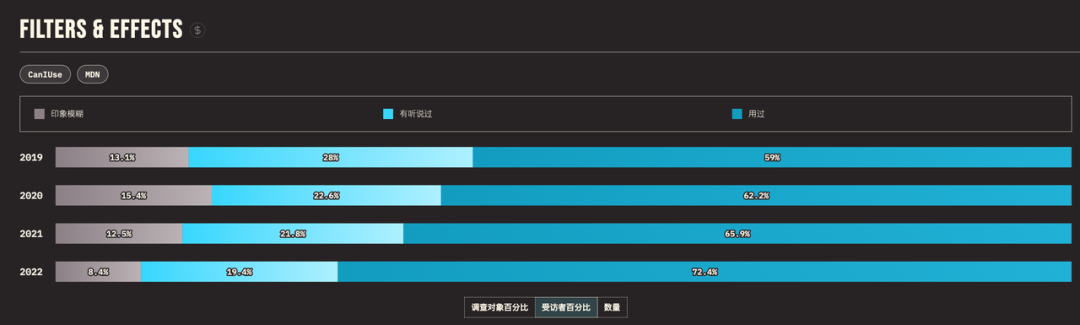 这个用于调整元素滤镜的特性在 2022 年使用率也有一定的上涨,总使用率已经达到 72.4%,普及率已经非常广了。
