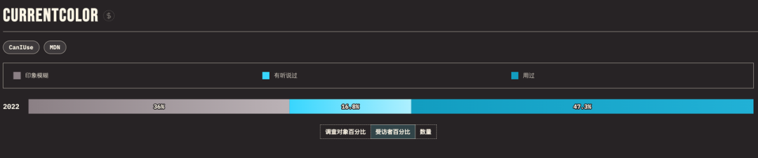 用于继承父元素的颜色,在 2022 年的调查中,也有 50% 的使用率,普及程度还是可以的。