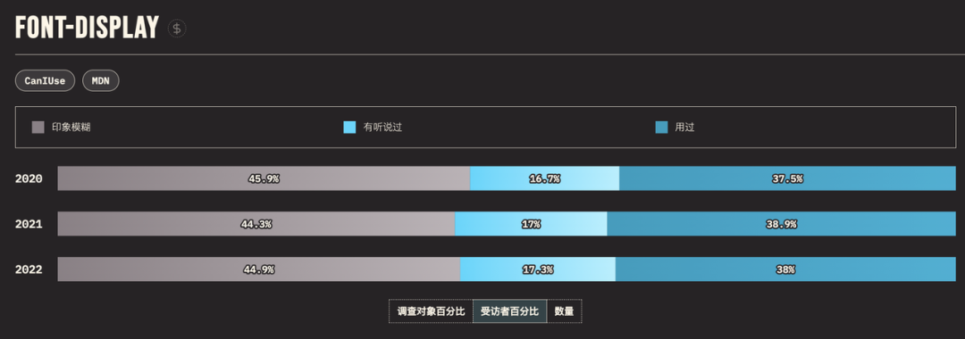 属性决定了一个 @font-face 在不同的下载时间和可用时间下是如何展示的。虽然这几年使用幅度没涨,但它已经是排版相关的特性中使用人数最多的了。