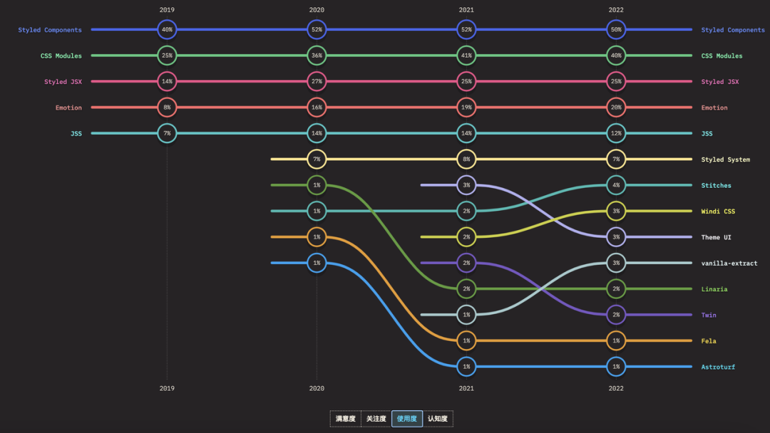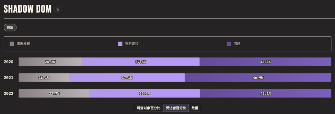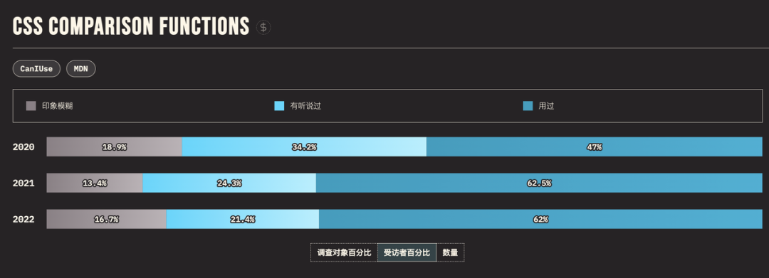 在这部分我们会看到很多 API 在 2022 年使用率反而有所下滑,这个主要是因为本次回收的问卷规模大了一倍,导致很多特性的使用率被稀释了。