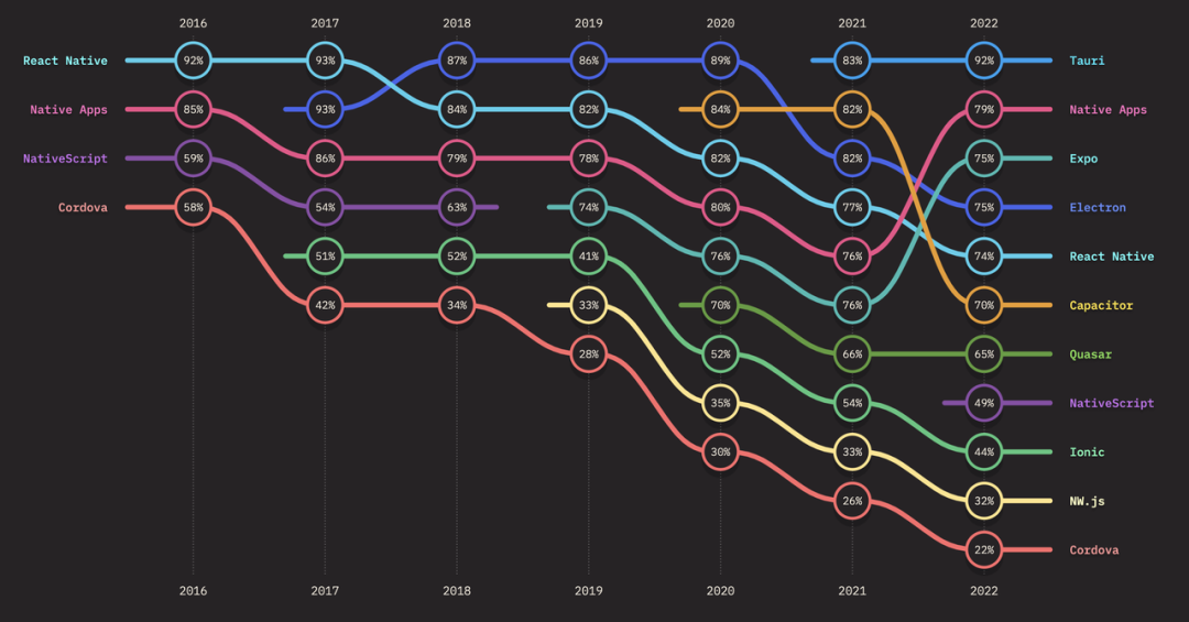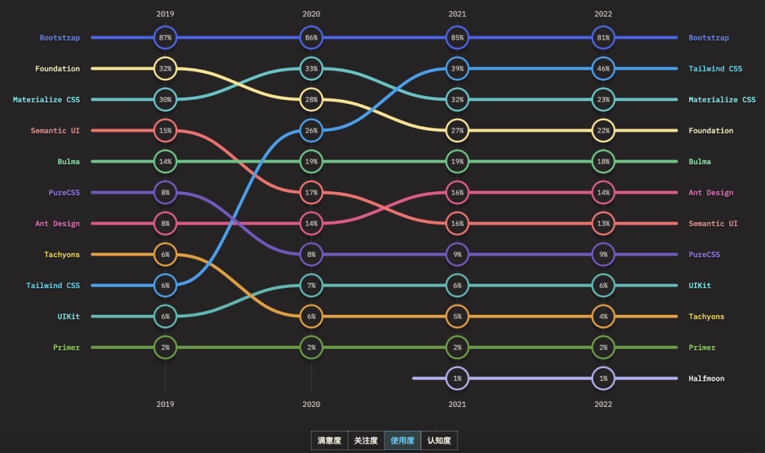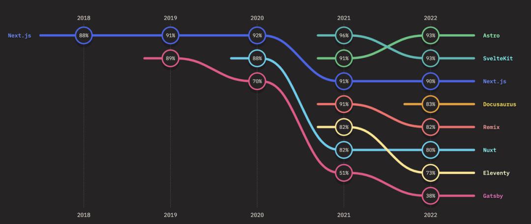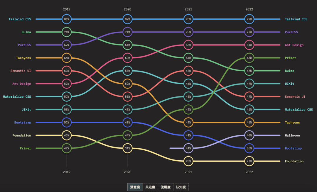 这样的成熟框架的满意度有所下降,但这种下降更多是由于工具经过实战测试并用于生产,找到了难用的边界,这其实是一个框架成熟的标志,这些框架也会因为这些「难用的边界」而持续创新并继续发展。