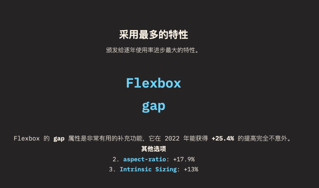 使用较多。在交互(Interactions)方面,今年的增长主要集中在滚动相关的特性上,比如控制滚动效果的 scroll-behavior