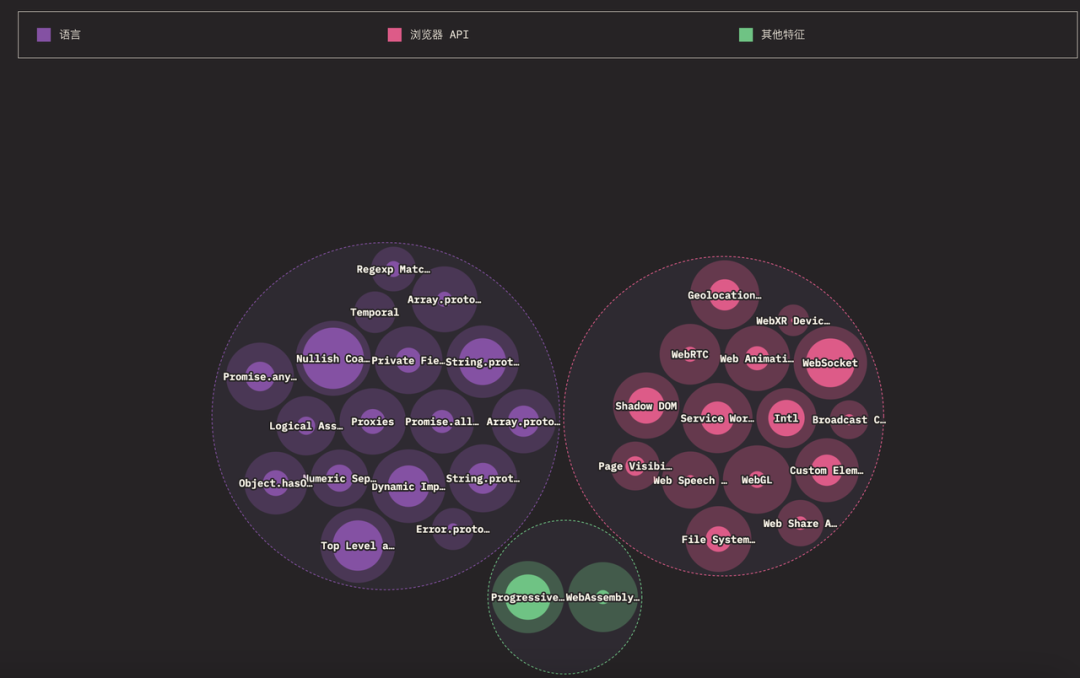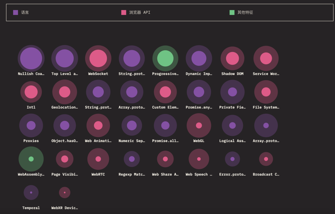 下图根据技术分类划分,显示了各种特性的采用率。外圈的尺寸代表了了解这个特性的用户数量, 而内圈的尺寸代表了实际使用这个特性的用户数量。