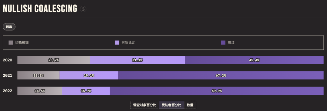 空值运算符的使用率逐年上升,今年已经有了将近 70% 的使用率,成为近几年使用人数最多的新特性。毕竟相比于||