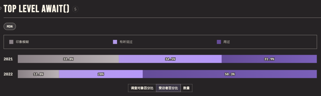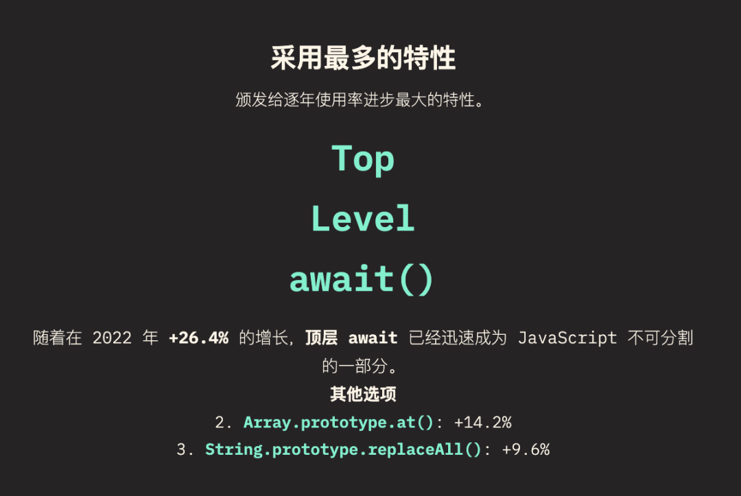 顶层异步函数在今年使用率有了 27% 的进步,是进步幅度最大的新特性。这其实与异步函数async await