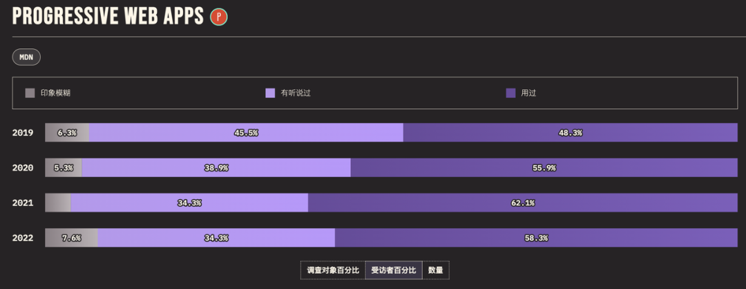 使用 PWA 的开发者在今年有小幅下跌,但它依然有着 58% 的使用率,普及程度依旧很广。