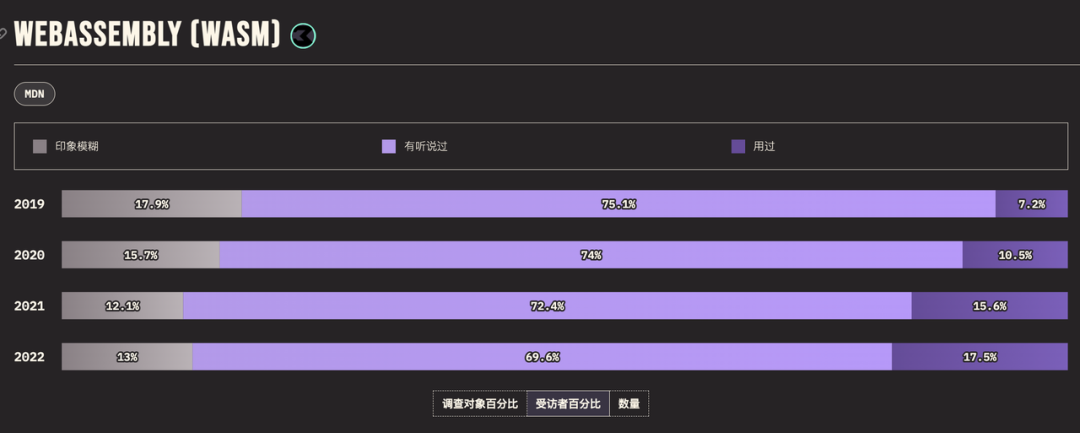 使用 wasm 的开发者在今年有小幅上涨,如今已经到了 17.5%,但听说过 wasm 的开发者很多,将近 70%,看来 wasm 应用落地的路还是任重而道远啊。