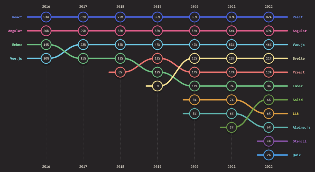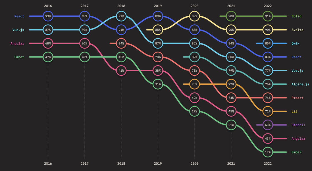 这两个新框架的满意度位居榜首,抛弃 Vdom 使其拥有了非常小的包体积和极佳的性能,确实能为开发者带来不错的体验。