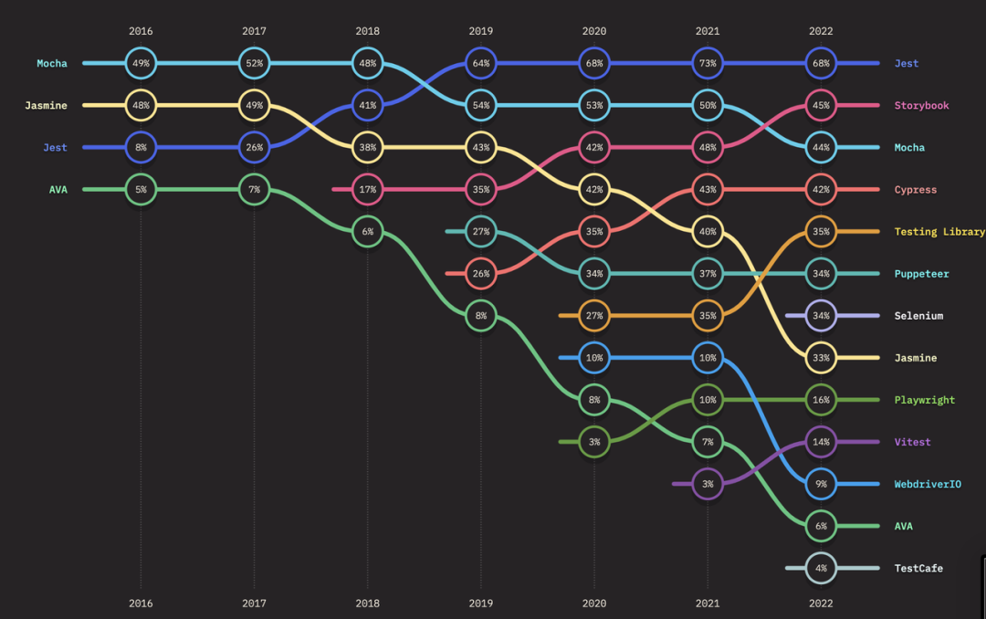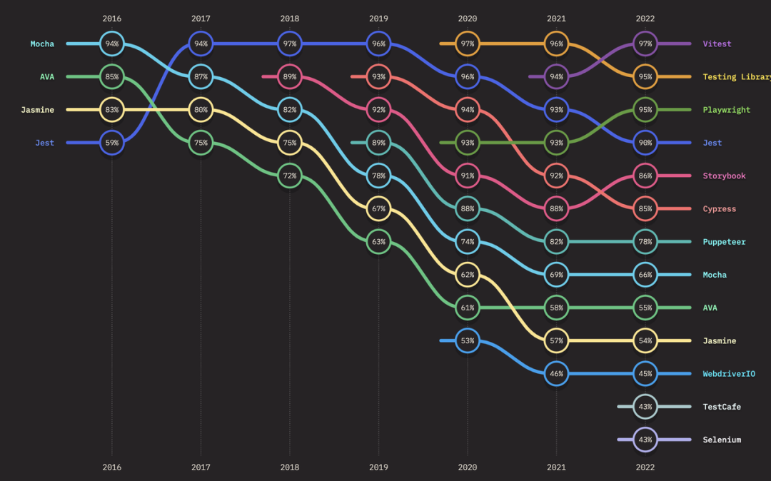 还是第一,但使用率下降了 5%。大部分测试工具下降的份额都被vitest