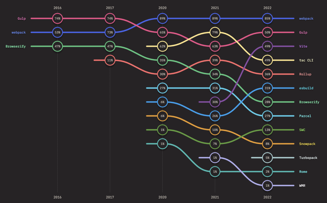 仍然处于最领先的地位,使用率高达 85%,但vite