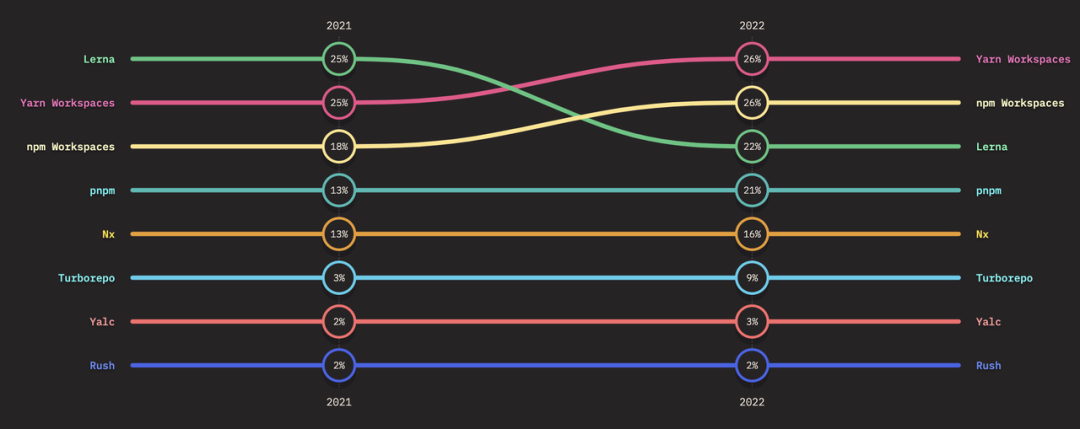 monorepo 因为有一些争议,所以总体使用率都不太高,没有超过 30%的。但综合满意度和使用率来考量,使用pnpm