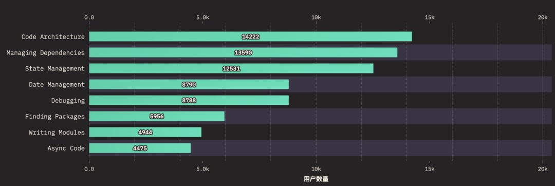 上图显示了开发者们认为目前 JS 的痛点问题,排名前三的是「代码架构」、「管理代码依赖」和「状态管理」。