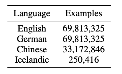 作者使用了深度为 32 层、宽度为 4096 hidden+16384 的 FFW 大型 decoder-only Transformer 就在 100M 级别的单语语料上进行训练、模型参数量在 8B 左右。各语种的数据量见下表