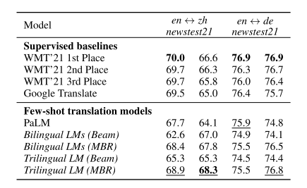 本文的效果非常惊艳。作者声称只使用 decoder-only 的模型(类似PaLM) [https://ai.googleblog.com/2022/04/pathways-language-model-palm-scaling-to.html] 、中量级的单语数据做训练,再在infer时加上五组双语对,就能让 few-shot 机器翻译的结果追平甚至超过 WMT’21 竞赛的优胜模型。