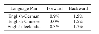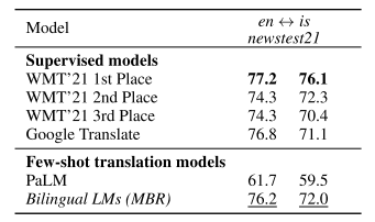 下表为小语种冰岛语的翻译效果。因为冰岛语较少,作者实际上是先在英、德单语上预训练,再在冰岛语单语上训练的(作者声称这种方法并不影响最终效果、只是为了训练启动更快)。有趣的一点是同为大模型的 PaLM 在小语种上效果很差,而本文的方法反而不错。