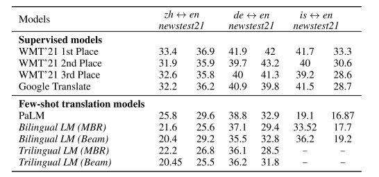 作者主要是和 WMT‘21 的前三模型以及自家的 LM 大模型 PaLM 做对比,所用的指标主要是自家的 BLEURT。