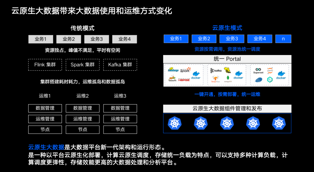 传统大数据组件繁多,安装运维复杂,在生产使用中需要大量的人力支持; 在线业务和大数据业务各自使用独立的资源池,使得资源流转困难,利用率低,成本上升; 传统大数据架构没有 CICD 机制,缺少测试和质量控制流程; 传统大数据缺少开箱即用的高可用、多租户、日志、监控、告警、认识、授权、审计、计费等能力。