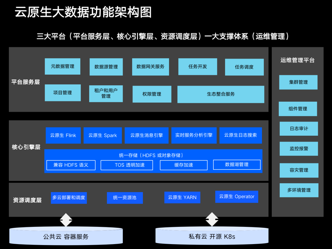 云原生大数据平台的功能架构可以总结为“三大平台和一大支撑体系”。三大平台分别是平台服务层、核心引擎层和资源调度层。
