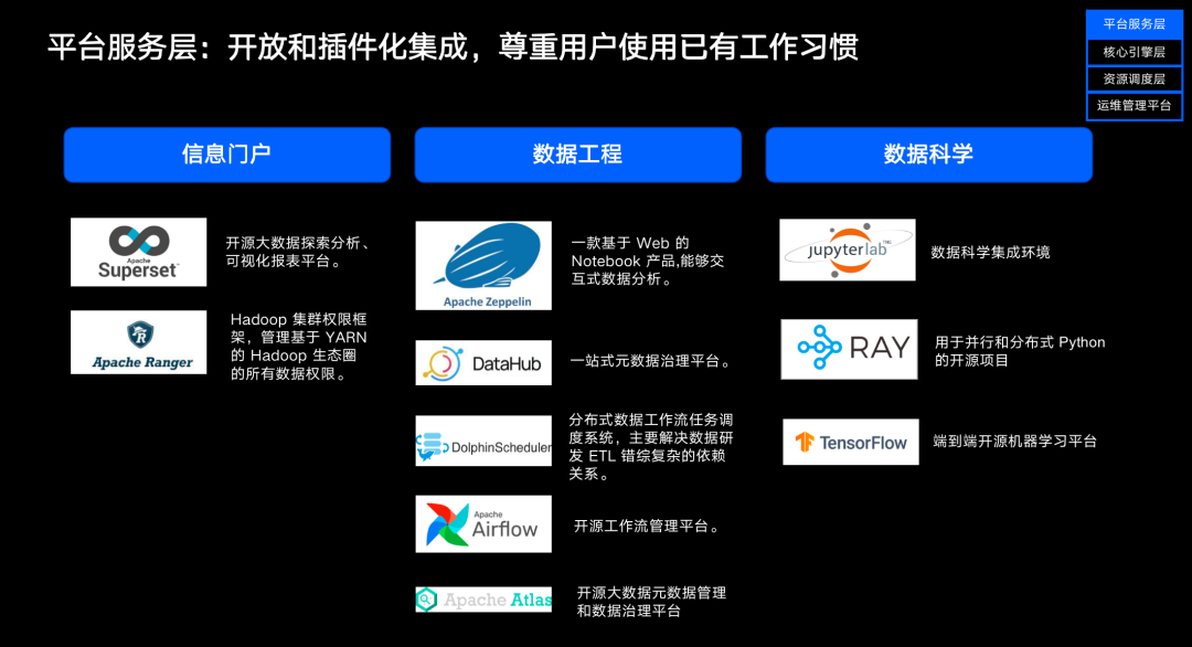 为了尊重现有用户使用习惯,将用户习惯使用的开源组件以插件化的形式进行了集成。现有主流的大数据工作场景主要包括信息门户、数据工程和数据科学三种,每个场景下都有许多用户常用的开源组件: