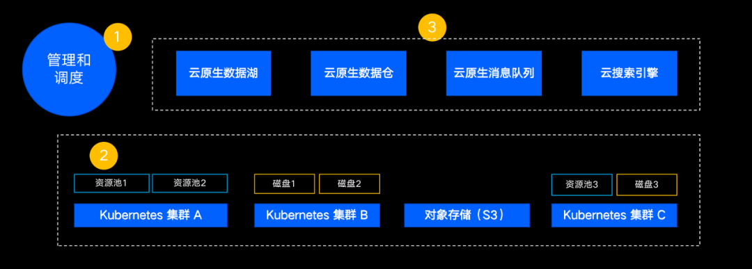 大数据平台应当具备可观测性、开源组件管理、服务生命周期管理、集群管理、 容灾管理的功能和服务,图中标蓝部分是云原生计算进行了特别增强的部分,下面来重点阐述一下: