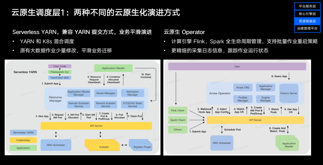 Serverless YARN:从上图可以看到,Resource Manager、Node Manager、Application Master 是 YARN 的三大组件。本方案是在 Resource Manager 中进行修改,增加了新的组件。经过这样改造之后,对于客户来说,新系统仍保持了通过 YARN Client 提交作业的使用方式,只是在 Resource Manager 这一层做了封装调度,让用户把作业直接提交到 API Server,而这个 API Server 其实是 K8s 的 API Server。也就是说,通过对 YARN 的 Resource Manager 进行改造,可以让原来使用 YARN 来提交资源请求的业务,平滑地把业务提交到 K8s 上 。 云原生 Operator:这种方案是针对现有大数据组件的云原生化部署,把 Flink、 Spark 等计算引擎以 Cloud Native (云原生)的方式部署到 K8s 上。这种方案的好处有两个,第一是可以通过 Operator 对计算引擎进行全生命周期的管理,帮助用户进行更优的批量作业重启策略;第二是云原生和 K8s 融合得更好,它可以更精细地采集 Pod 上的日志,跟踪整个大数据的引擎和作业的运行状态。