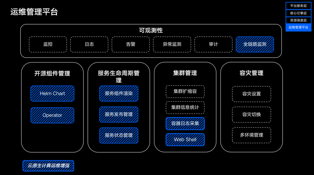一大支撑体系是运维管理平台,是集开源组件、服务生命周期、集群、容灾、可观测性于一体的一站式管理平台。