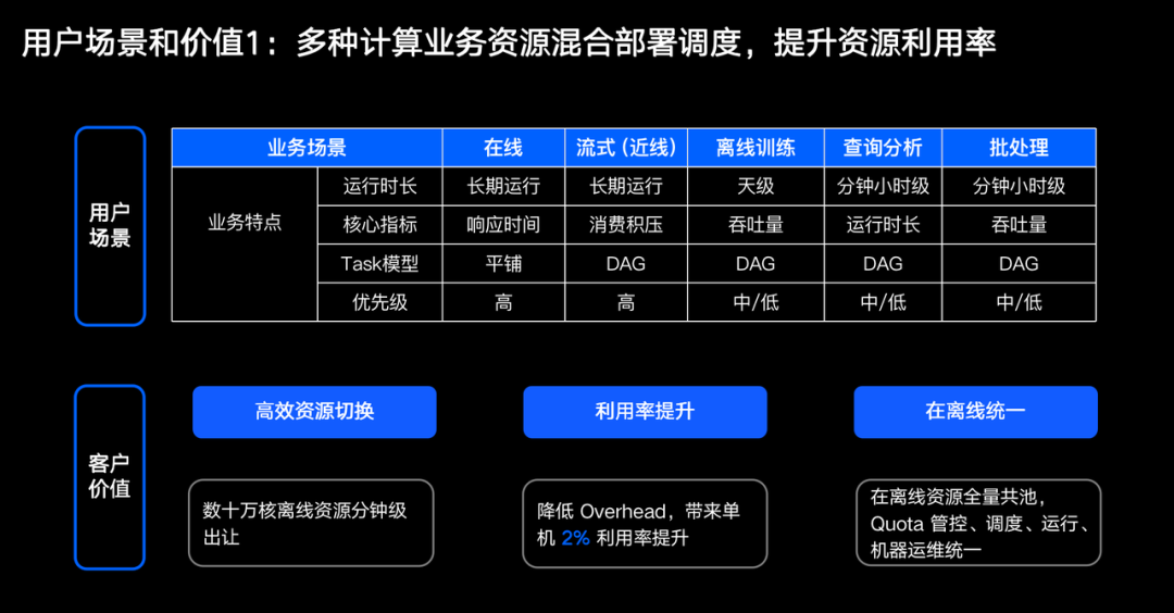 在混部的用户场景下,云原生大数据平台支持很多的业务场景,包括在线、流式、离线、查询分析和批处理等。