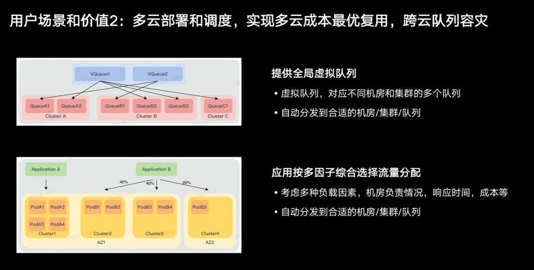 提供全局虚拟队列:在用户使用多云的场景下,首先需要提供一个全局虚拟队列的概念。如上图,一个虚拟队列就是一个资源池,下面对应不同的两个物理资源池。用户在提交的时候,不需要关注实际对应的集群,而是提交到一个虚拟队列上,下层会针对作业进行相应的调度,自动分发到合适的集群/机房/队列上,能够有效提升容灾能力。 应用按多因子综合选择流量分配:多云部署的另一个好处是可以通过多种因素的综合考虑来选择流量分配。比如在一个多云场景下,AZ1 理解为厂商1,AZ2 是厂商2,现在发现使用同样多的 CU,在厂商2上比在厂商1上贵50%,那就可以通过多云调度把流量尽量分发到厂商1上。这是从成本角度考虑的一种情况,当然还可能存在虽然成本降低,但经常宕机,响应时间较长,任务状态出错率高的情况,那就需要把重要的应用放到各方面指标较好的机房里,总的来说就是通过多种因子的综合考量进行流量分配。在多云部署场景下,帮助用户实现多云成本的最优复用。
