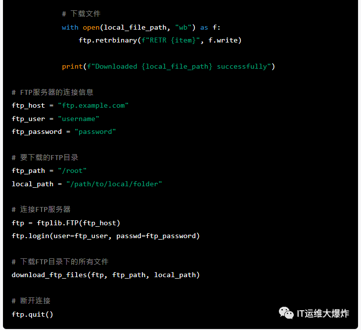 ftp.retrbinaly("RETR filename.txt", file_handel, bufsize) # 上传FTP文件