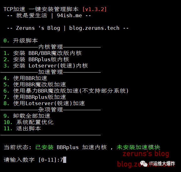 安装成功,重启VPS之后我们重新连接服务器。输入下列指令来启用其BBR plus,按照脚本菜单选项,选择对应安装的功能,来启用加速: