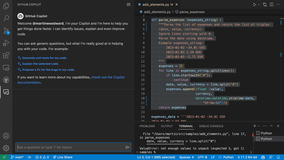 使用 GitHub Copilot Chat 可以在代码编辑器中获得类似于 ChatGPT 的体验。它是嵌入代码编辑器(IDE)中的一个聊天窗口,可以识别开发人员键入的代码、显示的错误消息。还可以深入分析和解释代码块的用途,生成单元测试,甚至获得针对错误的建议修复。它建立在 OpenAI 和微软在 ChatGPT 和新 Bing 上所做的工作之上。还将加入语音到代码 AI 技术扩展,将其称为 GitHub Copilot Voice,开发人员可以直接口头给出自然语言提示。