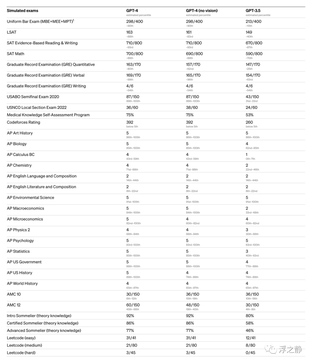 为了理解这两个模型之间的区别,进行了各种基准测试,包括模拟最初为人类设计的考试。使用了最近公开可用的测试(在奥林匹克竞赛和 AP 自由响应问题的情况下)或购买了 2022-2023 版的练习考试。在这之前没有对这些考试进行过具体的训练。在考试中的少数问题在训练期间被模型所看到,但团队认为结果是具有代表性的——有关详细信息,请参阅 technical report[3]。