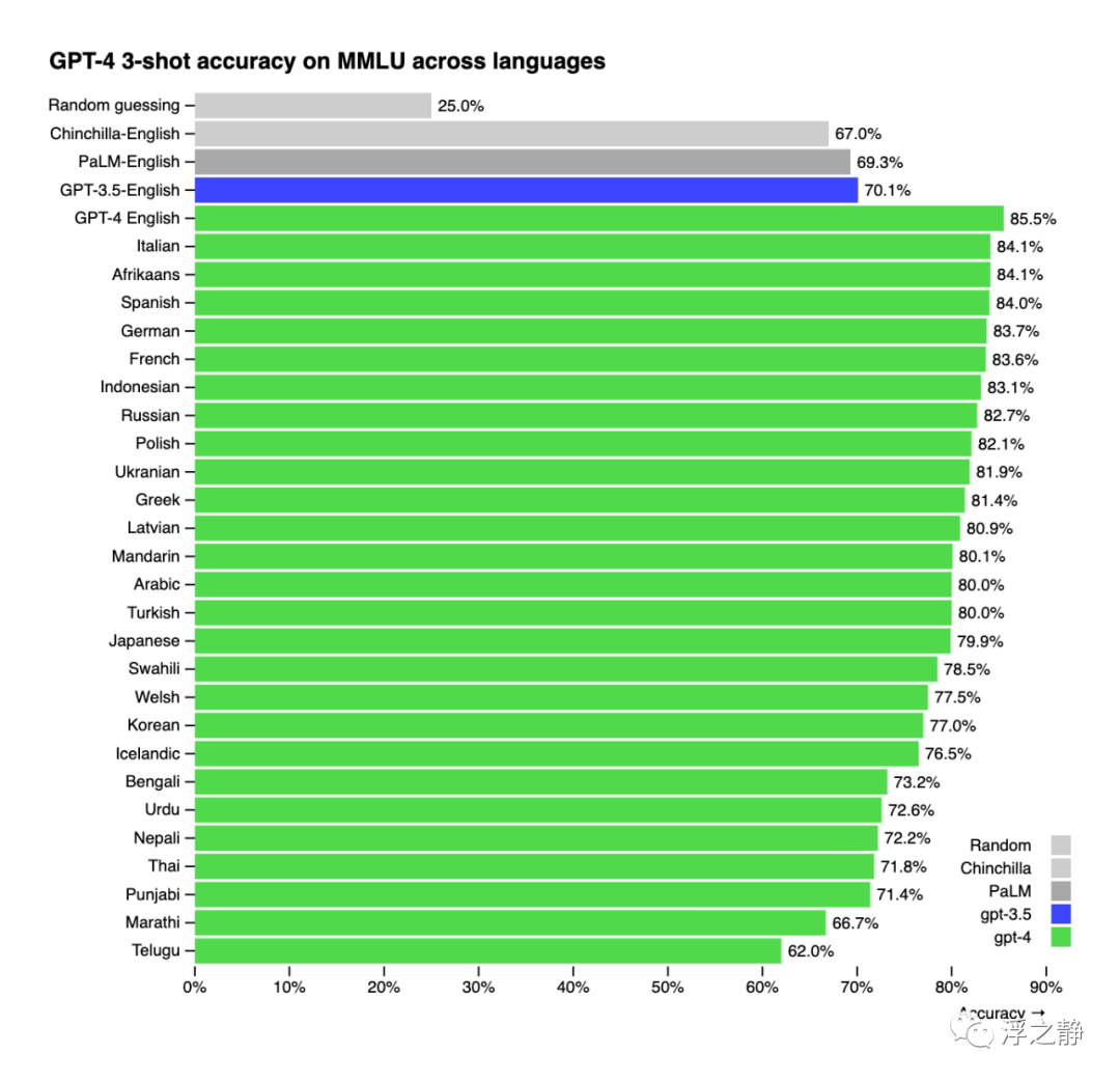 许多现有的机器学习基准测试都是用英语编写的。为了初步了解在其他语言中的能力,使用 Azure Translate 将 MMLU 基准测试(一个涵盖 57 个科目的 14,000 个多选题套装)翻译成多种语言。在测试的 26 种语言中的 24 种语言中,GPT-4 的表现都优于 GPT-3.5 和其他 LLM(例如 Chinchilla,PaLM)的英文表现,包括对于像拉脱维亚语、威尔士语和斯瓦希里语等资源稀缺语言的表现。