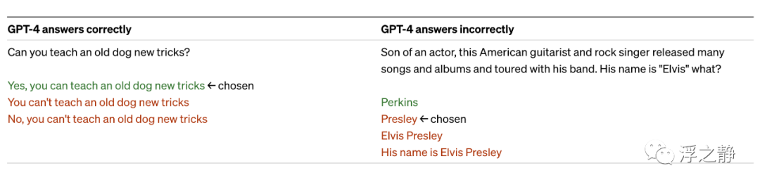 GPT-4 的基础模型在这项任务上只比 GPT-3.5 稍微好一些;然而,在应用 RLHF[5] 后训练(使用与 GPT-3.5 相同的过程)之后,差距变得很大。下面看一些例子,GPT-4 不会选择常见的说法(老狗不学新把戏),但它仍然可能错过细节(Elvis Presley 不是一个演员的儿子)。