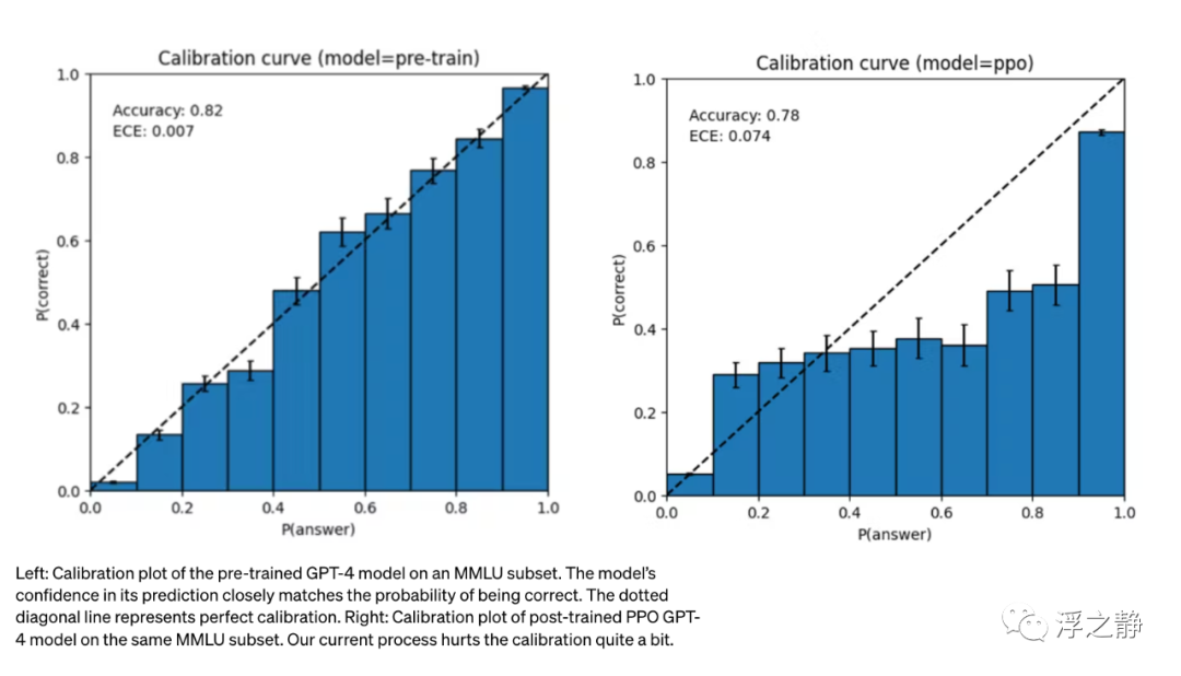 GPT-4 在其预测中也可能自信地偏离正确答案,没有在可能犯错时仔细检查工作。有趣的是,基础预训练模型高度校准(它对答案的预测置信度通常与正确率相匹配)。然而,通过 OpenAI 当前的后期训练过程,校准性降低了。