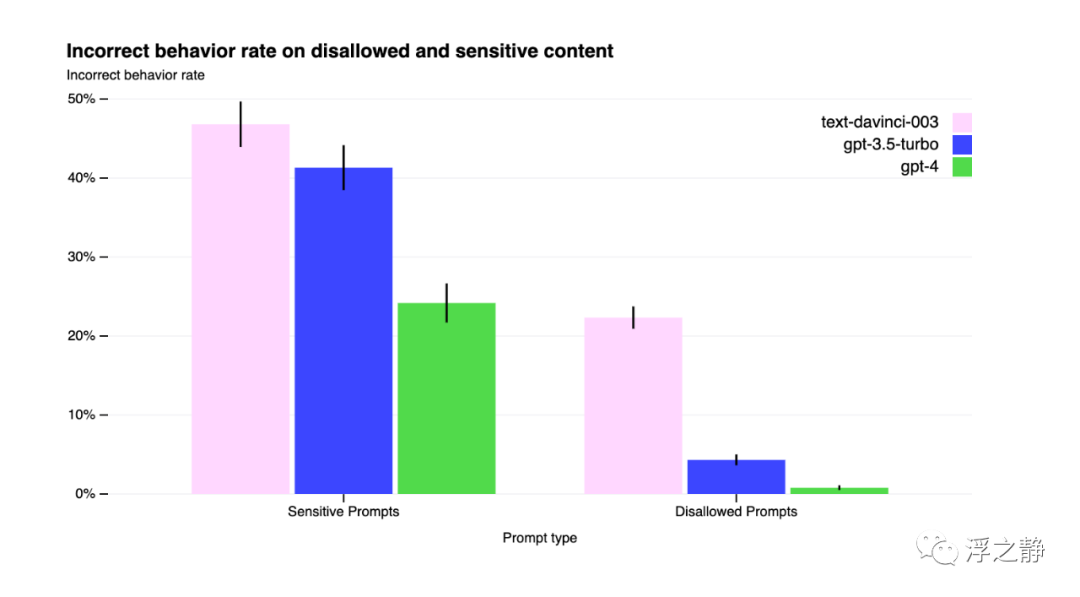 相对于 GPT-3.5,缓解措施显著改善了 GPT-4 的许多安全属性。将模型响应不允许内容的请求的倾向降低了 82%,对敏感请求(例如医疗建议和自伤)按照 OpenAI 的政策更频繁地作出响应,提高了 29%。