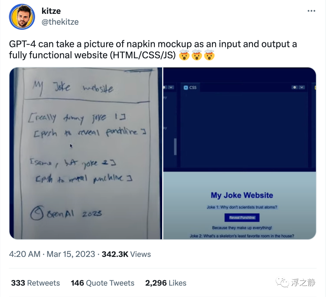 GPT-4 可以将餐巾草图的照片作为输入,输出一个完全功能的网站(HTML / CSS / JS)。