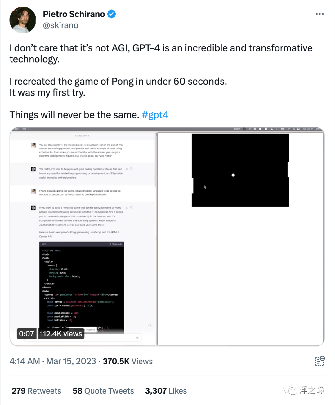 @skirano[8]:我不在乎它不是 AGI,GPT-4 是一项令人难以置信和具有变革性的技术。我在不到60秒的时间里重新创建了乒乓游戏,而且这还是我第一次尝试。一切都将不再一样。