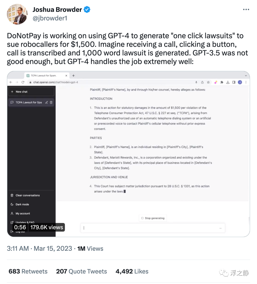 DoNotPay 正在使用 GPT-4 生成“一键诉讼”,以起诉自动拨号者索赔1500 美元。想象一下,当你接到一个电话,点击一个按钮,通话被转录并生成了一份 1000 字的诉讼书。GPT-3.5 的表现不够好,但是 GPT-4 非常适合这项工作。