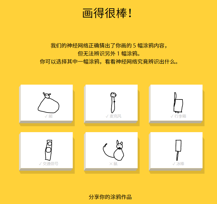谷歌推出的很有意思的小游戏,系统告诉我词语,我在页面中将它画出来,人工智能会猜你画的,猜对了说明你画的像。