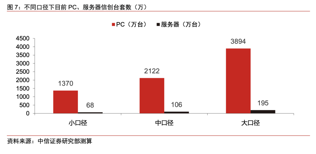 市场规模测算:中口径 PC、服务器(均含软硬件)信创市场空间达 1433 亿。小口径下数据库市场40亿,中口径下市场62亿,大口径下114亿。
