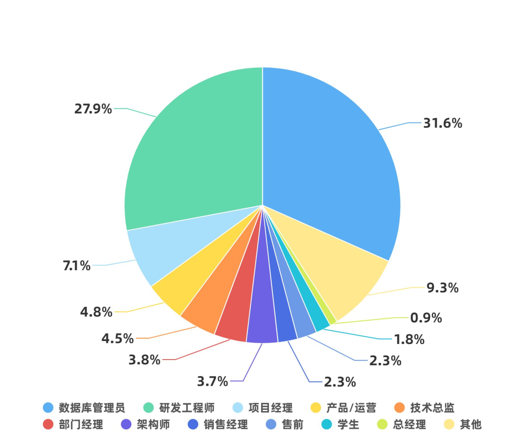 在所有受访者中,数据库管理员占比31.6%,研发工程师占比 27.9%,两者合计59.5%,是比例最大的两个群体。