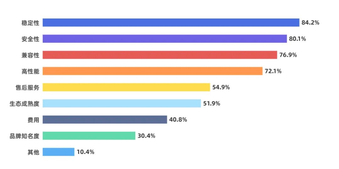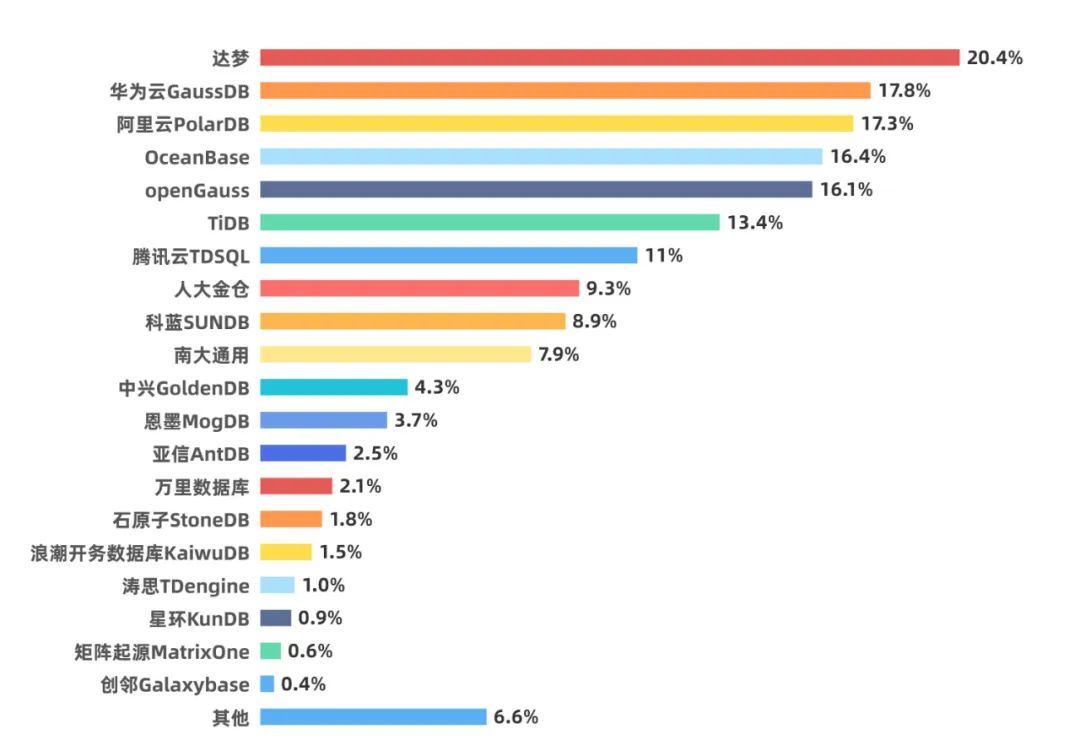 调查报告数据显示,有20.4%的用户使用了达梦数据库,此外,华为云 GaussDB占比 17.8%,阿里云 PolarDB 占比 17.3%,OceanBase占比 16.4%,openGauss 占比 16.1%,TiDB 占比 13.4%.