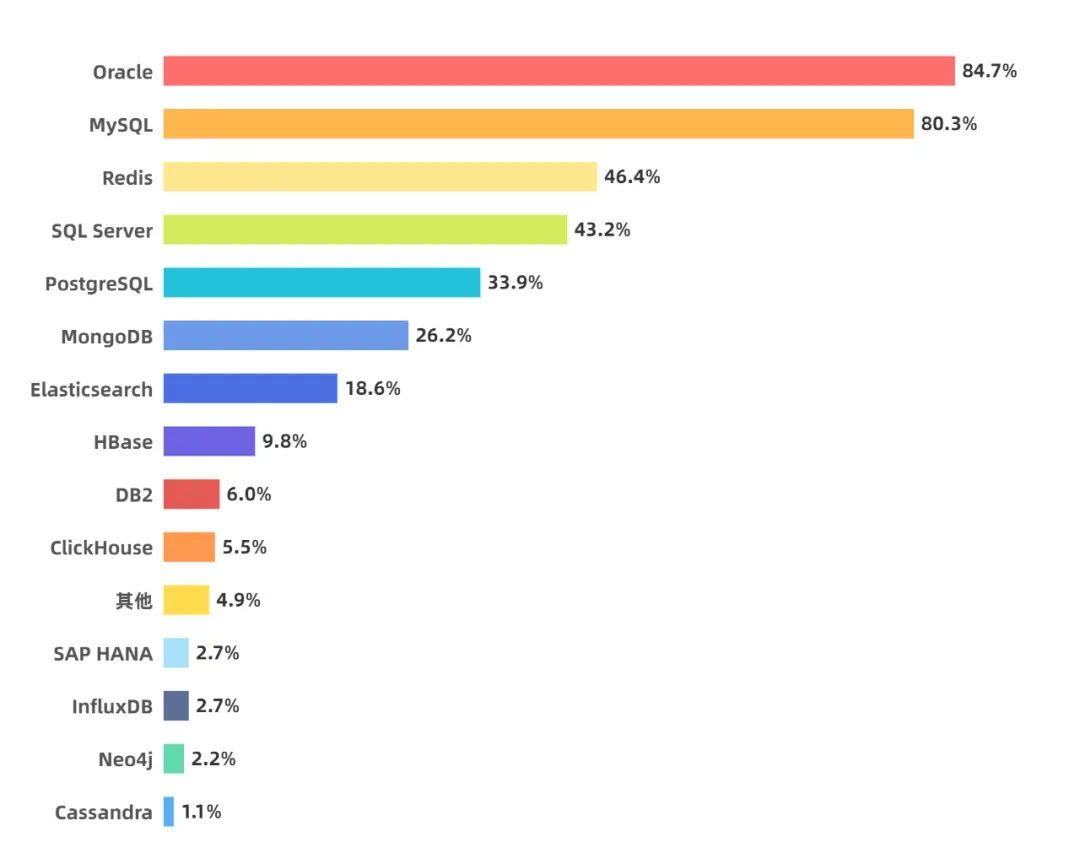 Oracle是被使用最多的国外数据库,其占比高达84.7%,MySQL以80.3%的占比排名第二,随后则是SQL Server、PostgreSQL、MongoDB、Elasticsearch等数据库
