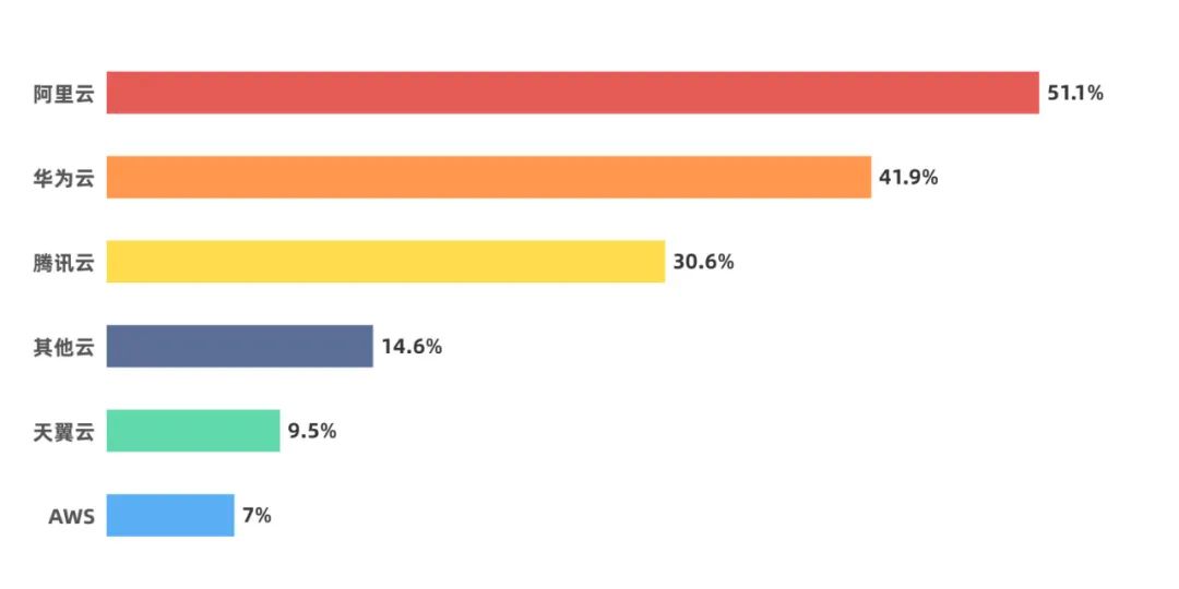 75.6%的企业正在使用云数据库,使用率最高的云数据库是阿里云数据库。调查数据显示,51.1%的受访者表示,其企业正在使用阿里云的数据库,华为云和腾讯云次之,分别占比41.9%和30.6%。全球领先的亚马逊云科技(AWS)在本次调研中,相比于2021年数据,占比下降2.85%至7%。