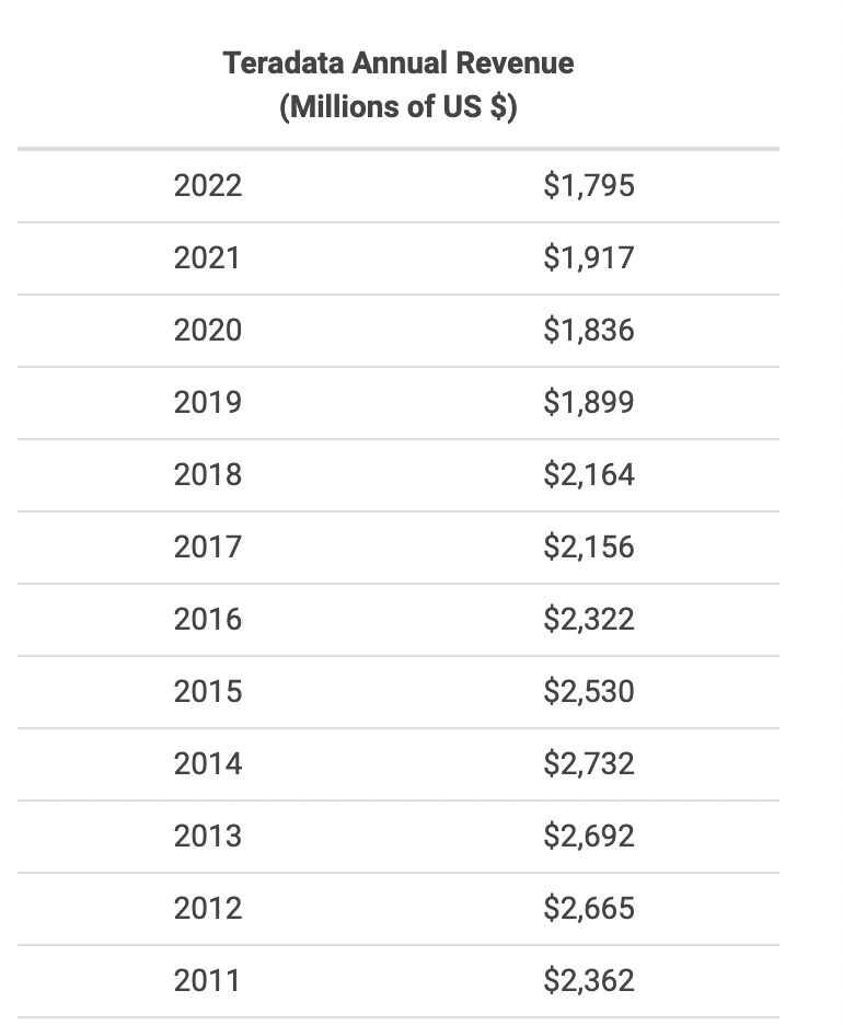 Teradata营收规模早就呈现出下降的趋势,公开数据显示,其营收由2011年的23.6亿美元下降到2021 年的19.2亿美元;2011-2021年,Teradata的营收增速CAGR为-2.1%。